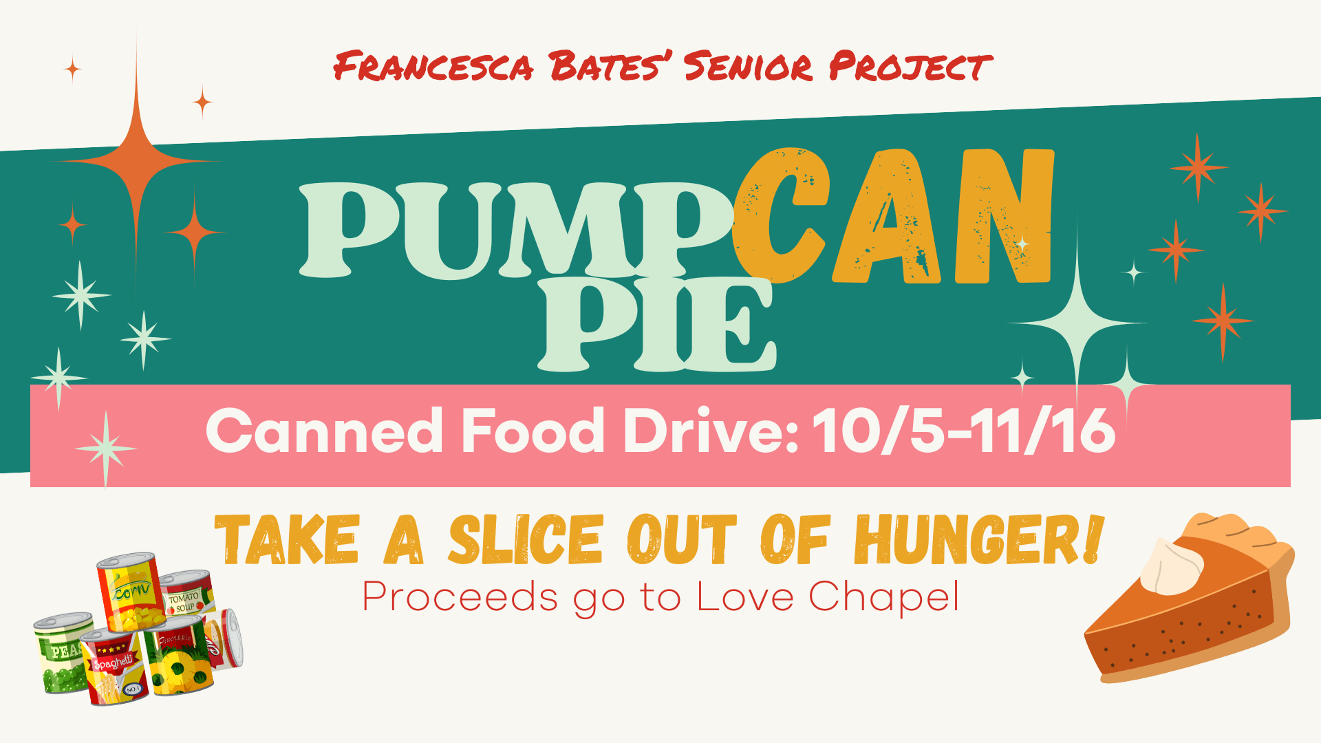 Now through November 16, Francesca is collecting canned goods for her senior project, PumpCAN Pie! On November 16, she'll use the donated cans to build a "slice of pie" for the FCC Students Friendsgiving event before delivering everything to Love Chapel.