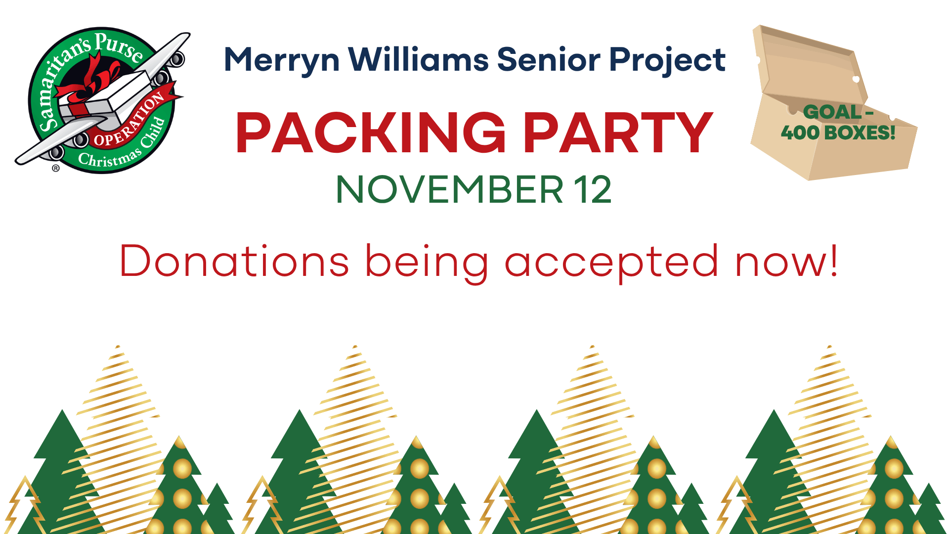 Help share the love of Jesus with children around the world through Operation Christmas Child! Merryn is leading this as her senior project, with a goal of packing 400 shoeboxes at the Packing Party happening on November 12 during Midweek.